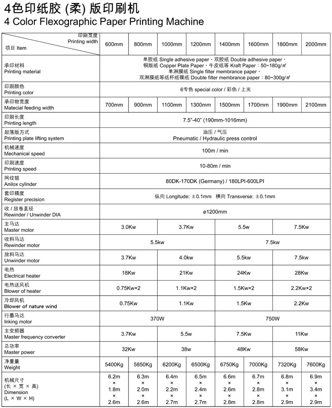 描述:本机是用感光树脂软版作为版材的印刷机,俗称“苯胺印刷机”。适合印刷聚乙烯、聚丙烯塑料袋、玻璃纸、卷筒纸,无纺布,编织袋等包装材料,是食品纸包装,超市手提袋、马夹袋、服装袋等包装的理想印刷设备 1、外形新颖、机构合理、工艺先进、操作简单、套印稳定、印刷质量好、印刷速度快、废品率极低、使用寿命长、容易维护保养 2、采用台湾主马达及行墨马达,日本变频调速,节省电,运行波动小 3、落版自动停止行墨马达,起版自动开始行墨装置 4、采用日本SNK进口轴承(单向轴承采用德国的) 5、起版与落版采用日本油研系统或SMC气压系统 6、底辊采用德国特殊钢材加工,并经过特殊工艺处理,并电镀10丝厚的硬保护层,跳动在0.01mm以下 7、铝合金导轮进行硬质氧化、动平衡、静平衡处理 8、设有独立干燥箱与冷风定型风箱,能有效地防止印刷后油墨粘连 9、放卷采用台湾全自动气液压纠编机控制系统 10、放卷与收卷采用日本三菱磁粉,台湾恒张力全自动控制系