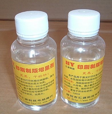 描述: 产品参数说明 本产品用于激光打印输出硫酸纸,激光毛膜,水性版纸等印刷版的图文加黑。 使用方法: 用脱脂棉制作2-3公分棉球或使用手笔,小排笔蘸少量药剂在图文表面轻轻地快速均匀涂刷一遍,数秒钟后即可晒版印刷。(请将适量增黑剂倒进量杯使用,拧好瓶盖以免挥发影响使用效果,使用过后量杯中的残液不可重复使用) 保存:放置于阴凉密闭处,远离火种,避免小孩触及。